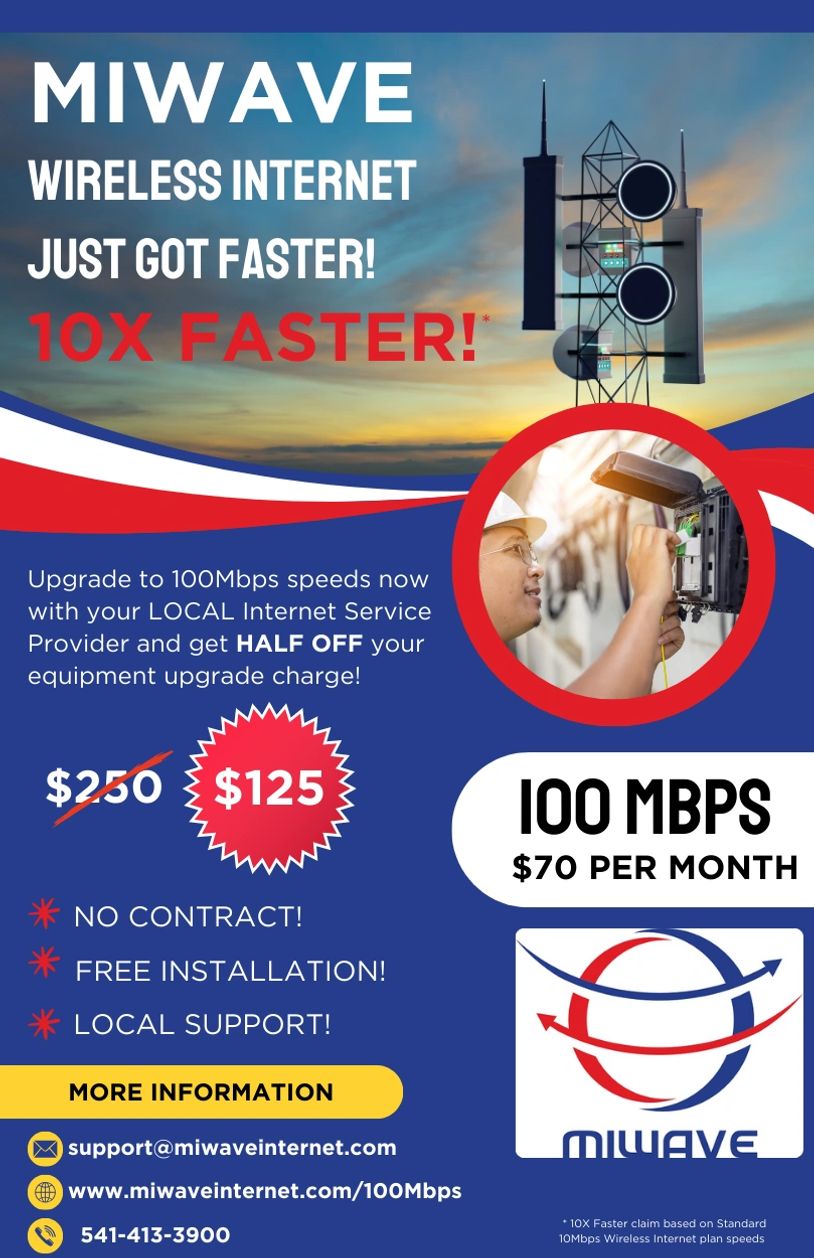 We recently upgraded our towers in the Burns-Crane-Buchanan area, and can now offer 100Mbps Wireless Internet Service to our customers! Please contact us for details by email or phone, or click below to send us a message.